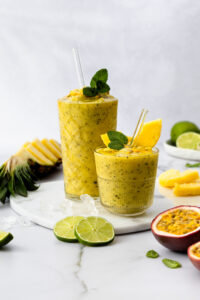 1. Gefrorene Ananas mit Saft der Limette, Maracujakernen und Minzeblättchen in einen Mixer geben. Plose Mineralwasser Naturale dazu gießen und auf höchster Stufe cremig pürieren.