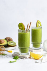3. Das vorbereitete Obst zusammen mit Babyspinat, Zitrone, Matchapulver und Eiswürfeln in einen Mixer geben, Plose Mineralwasser Naturale angießen und auf höchster Stufe cremig pürieren. Auf zwei Gläser verteilen und genießen.